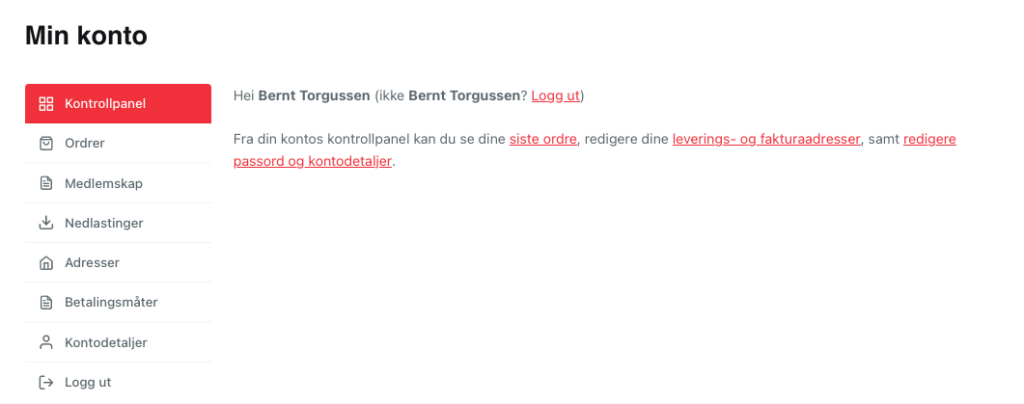 - Er du allerede logget inn, klikker du bare Kontrollpanel for å komme til Min konto – din personlige side i nettbutikken.