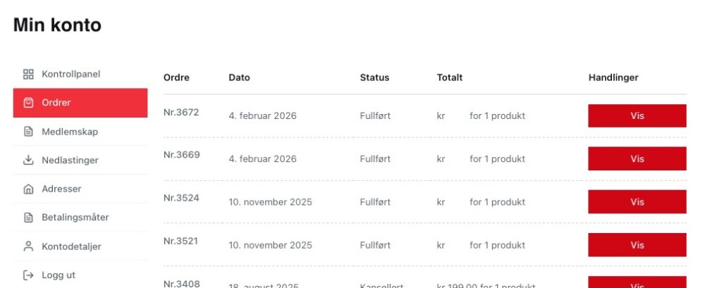 - Klikk på Ordrer i menyen til venstre for å se alle kjøpene dine.